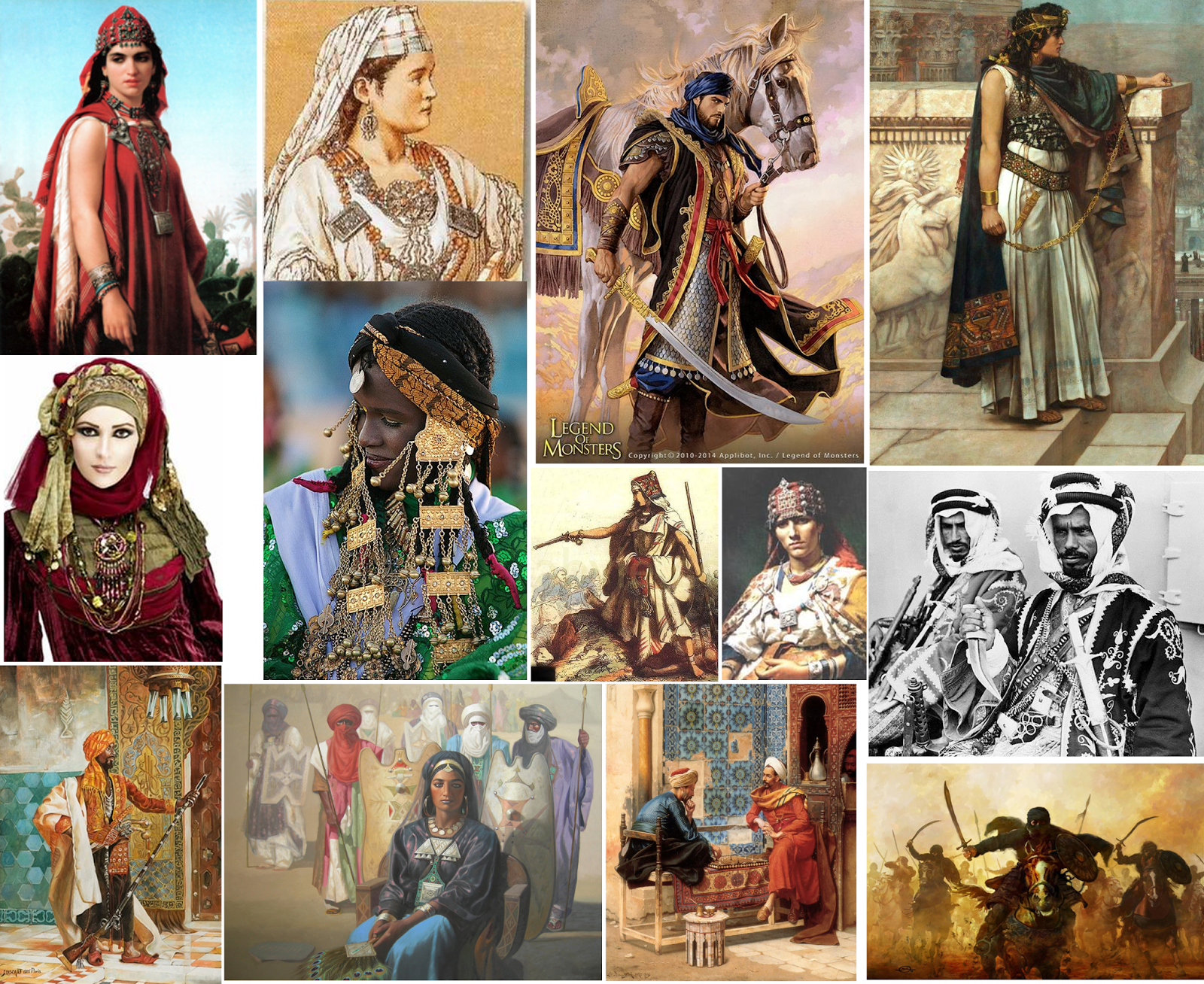 I've been looking at Arabic stories of queens and Arabic songs, and I've come to like the story of "Dahlia, Queen of the Berbers". This influence map shows intricate outfits and Arab warriors, and although I do like intricate outfits, I need to simplify them in order to make a successful end model. I would keep the traits of these outfit designs, and i'm keeping in mind the style of the Assassin's Creed franchise in terms of design and outfits, but not as complex.